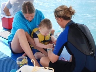 Leider verläuft das Schwimmen nicht wie gewünscht, denn Papito hat keine Lust auf uns. Er schwimmt immer zu seiner ebenfalls im Therapiebecken anwesenden Mutter Geegee. Wir sind sehr frustriert und enttäuscht, haben aber einen ersten Eindruck wie sich ein Delfin anfühlt. Man kann es nicht beschreiben, auf jeden Fall ein tolles Gefühl.