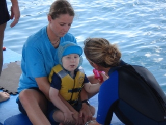 Gegen 08.30 Uhr stehen wir auf und freuen uns auf ein unvergessliches Schwimmen mit Jaruns Delfin Papito, denn heute ist Familienschwimmen. Doch zuvor gilt es zu frühstücken und gegen 10.30 Uhr einen Leihwagen zu bestellen: wir hatten uns ja mit Malinde und ihrer Familie zu einem Ausflug in den Westteil der Insel verabredet. Da die Zeit knapp wird, beschließen wir, dass Mama und Jarun schon einmal zum Therapiezentrum gehen, während Papa ins Büro der Autovermietung im benachbarten Lions-Dive Hotel auf die Dame der Autovermietung wartet. Papa schafft es fast pünktlich um 11.00 Uhr da zu sein. Jarun ist in guten Händen und wir Eltern werden nun mit Flossen und Schwimmgurt ausgerüstet. Wir sind sehr gespannt auf die Begegnung mit Papito, denn wir haben noch nie einen Delfin gestreichelt.